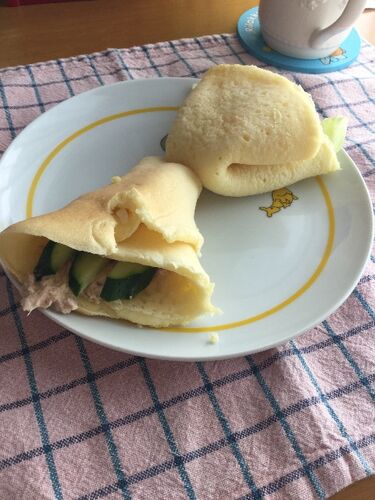 休みの日はいつもホットケーキなので、クレープのようなものを作りました。ホットケーキの裏に書いてある牛乳の量を2倍にして、出来るだけ薄くなるようにしてフライパンで焼きました。 ツナはマヨと麺つゆで味付けしたものを使います。 うん? デキルダケ薄…